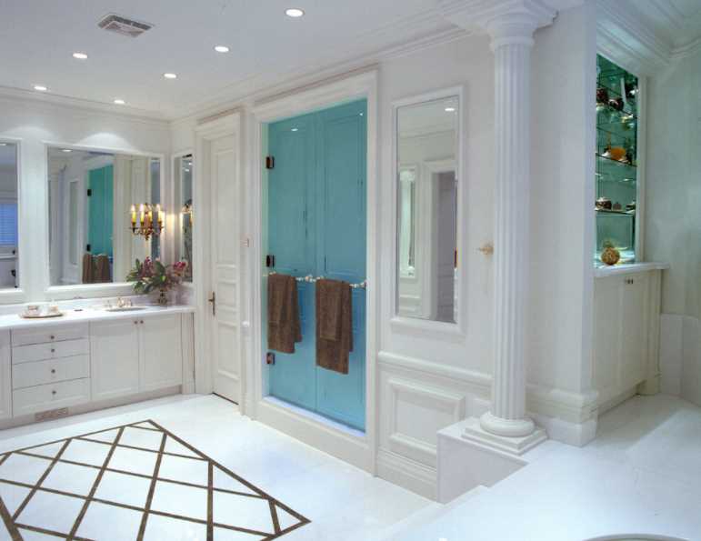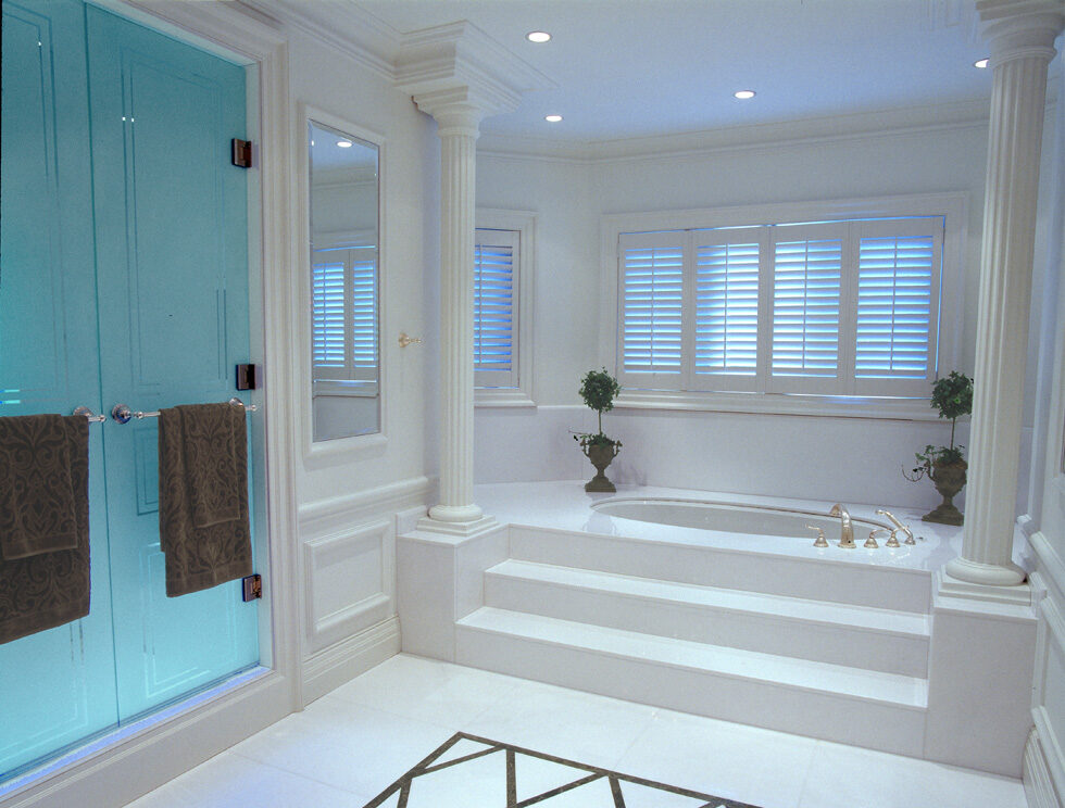 Master Bathroom in Lake Simcoe Home capturing the colors of a Greek Island swathed in Thassos slabs and floor inlaid with Imperador Marble detail. Custom millwork and horsehair plaster on walls and columns. Faucets and hardware are detailed in Silver.